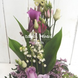 composition de muguet et de fleurs colorées piquées dans la mousse hydrophile. le choix des fleurs sera en fonction de la disponibilité le jour de la livraison.