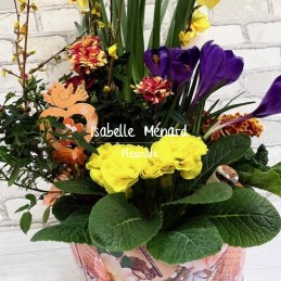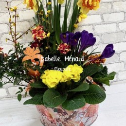 joli contenant en métal blanc orné de papillon et fleurs, et ses fleurs de jonquilles et primevères. La couleur des primevères peut changer suivant l'arrivage