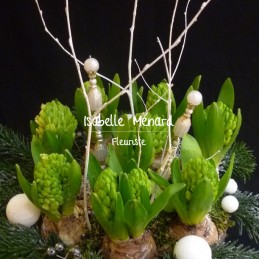 la jacinthe: jolies fleurs en grappe, elles forment de belles clochettes parfumées. Présentées dans contenant décoratif et décor "nature": écorces, mousse, sapin parfumé... fleurs à bulbe: A profiter pendant les fêtes de fin d'année à l'intérieur, à planter au jardin après la floraison. la décoration peut varier en fonction de l'approvisionnement du moment