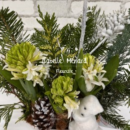 la jacinthe: jolies fleurs en grappe, elles forment de belles clochettes parfumées. Présentées dans contenant décoratif et décor de fêtes. fleurs à bulbe: A profiter pendant les fêtes de fin d'année à l'intérieur, à planter au jardin après la floraison. Le contenant et la décoration peuvent varier en fonction de l'approvisionnement du moment