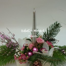 orchidée et ses nombreuses petites fleurs, dans contenant décoratif et sa déco de fêtes.