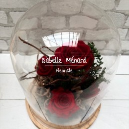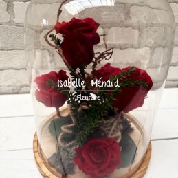 5 belles roses rouges éternelles présentées sous une grande cloche en verre.